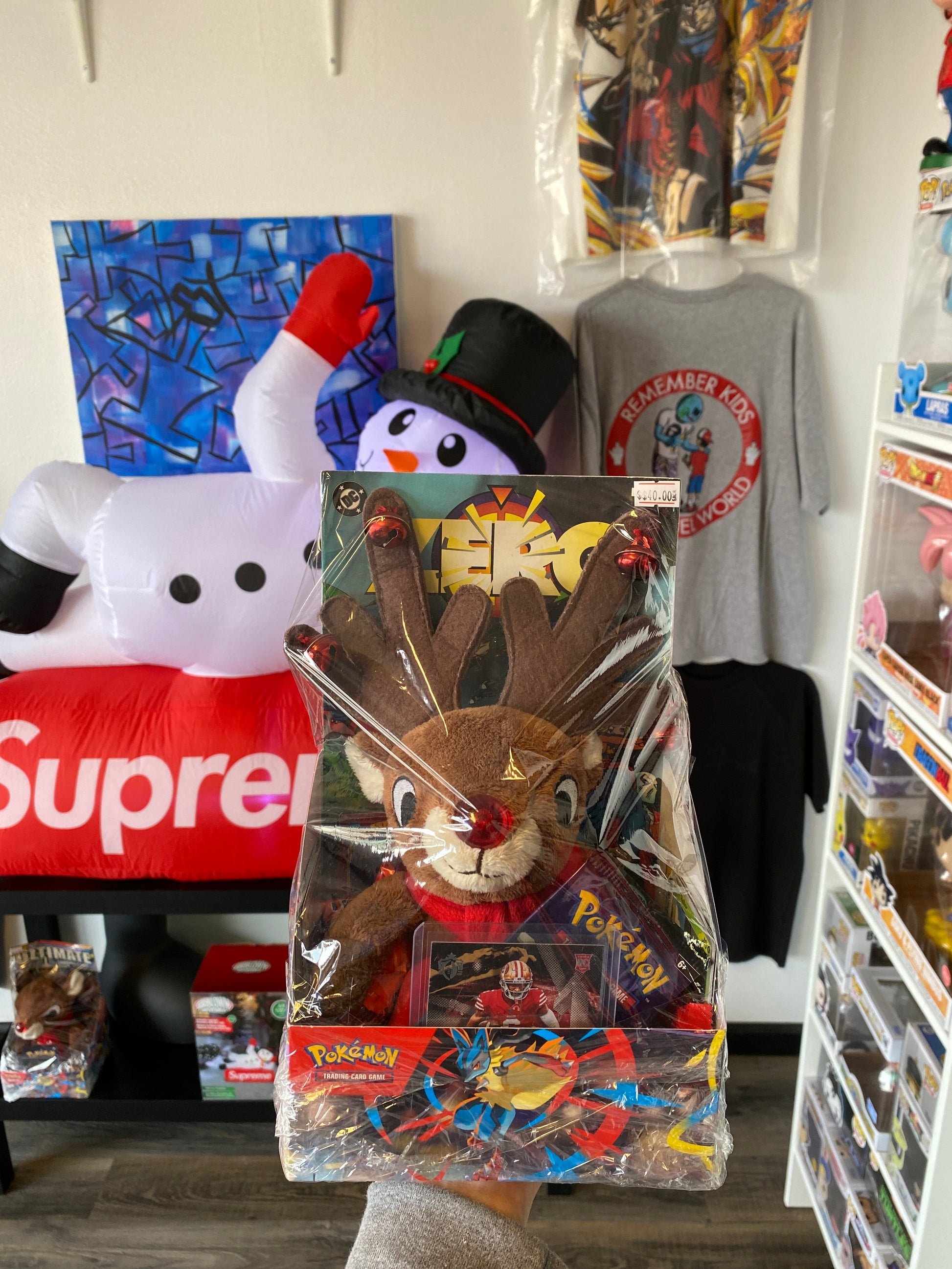 Comes with 1 toy rain deer, 1 comic book, 1 Pokemon pack, 2 sports cards inside sleeve, multiple single miscellaneous cards, multiple miscellaneous candy bars.