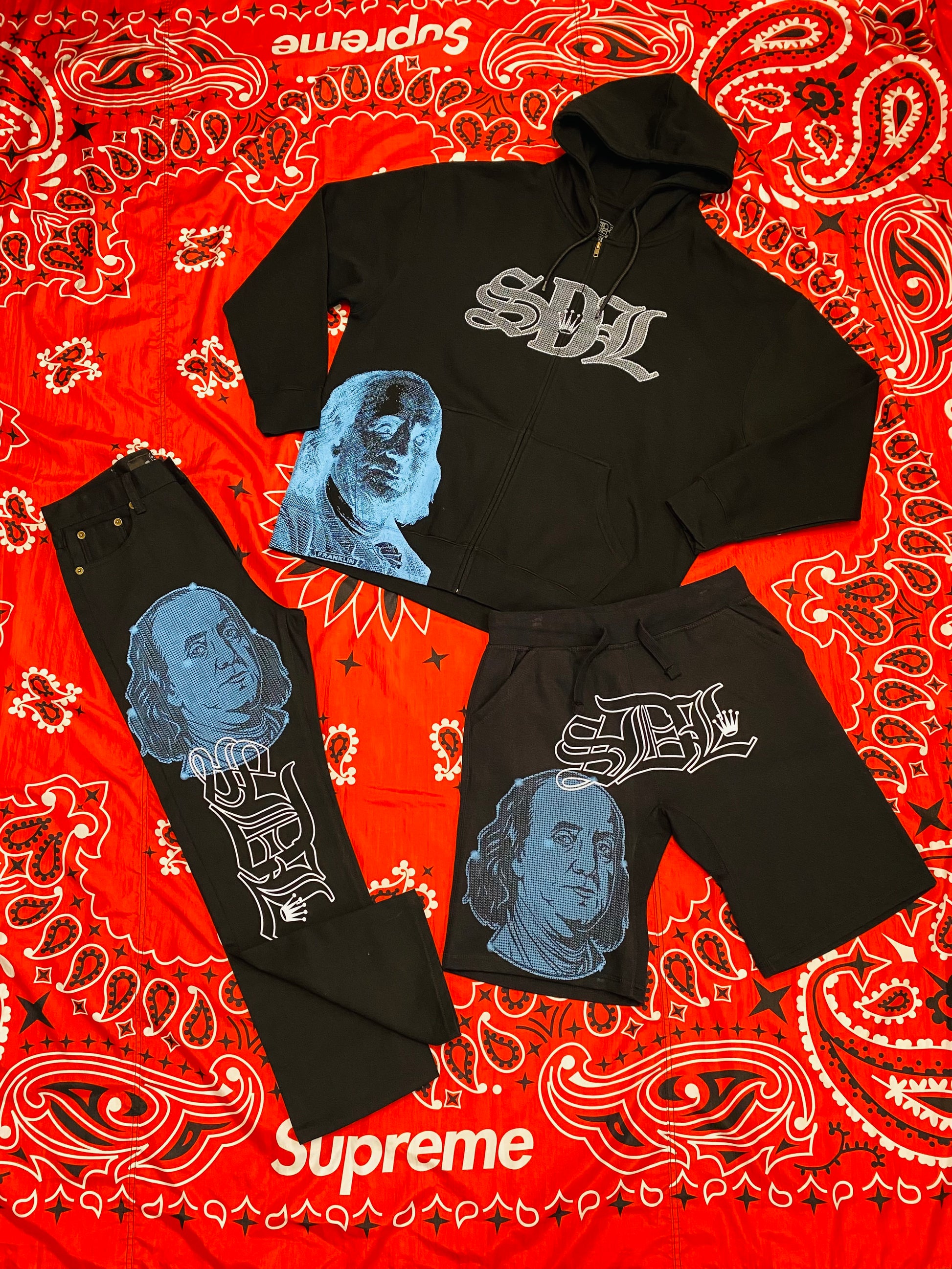 Set of 3. Size 34x30 Jeans, Large Shorts, 2X Hoodie